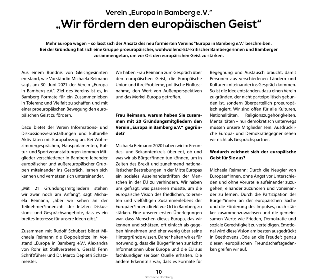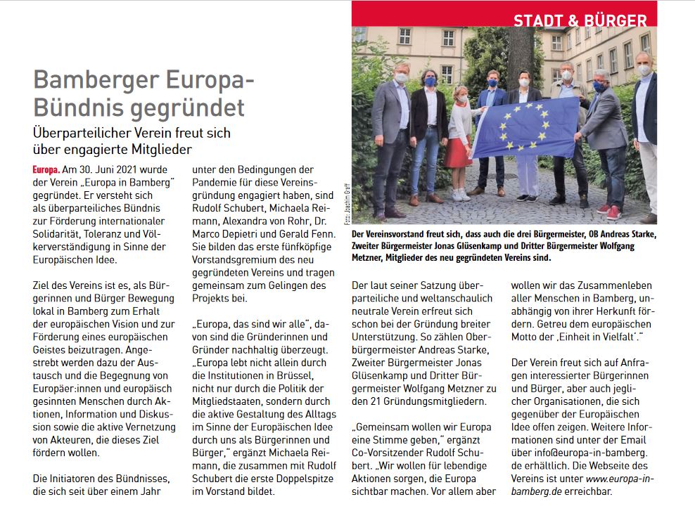Bamberg, 30. Juni 2021 – Heute wurde der Verein „Europa in Bamberg“ gegründet. Er versteht sich als überparteiliches Bündnis zur Förderung internationaler Solidarität, Toleranz und Völkerverständigung in Sinne der Europäischen Idee.