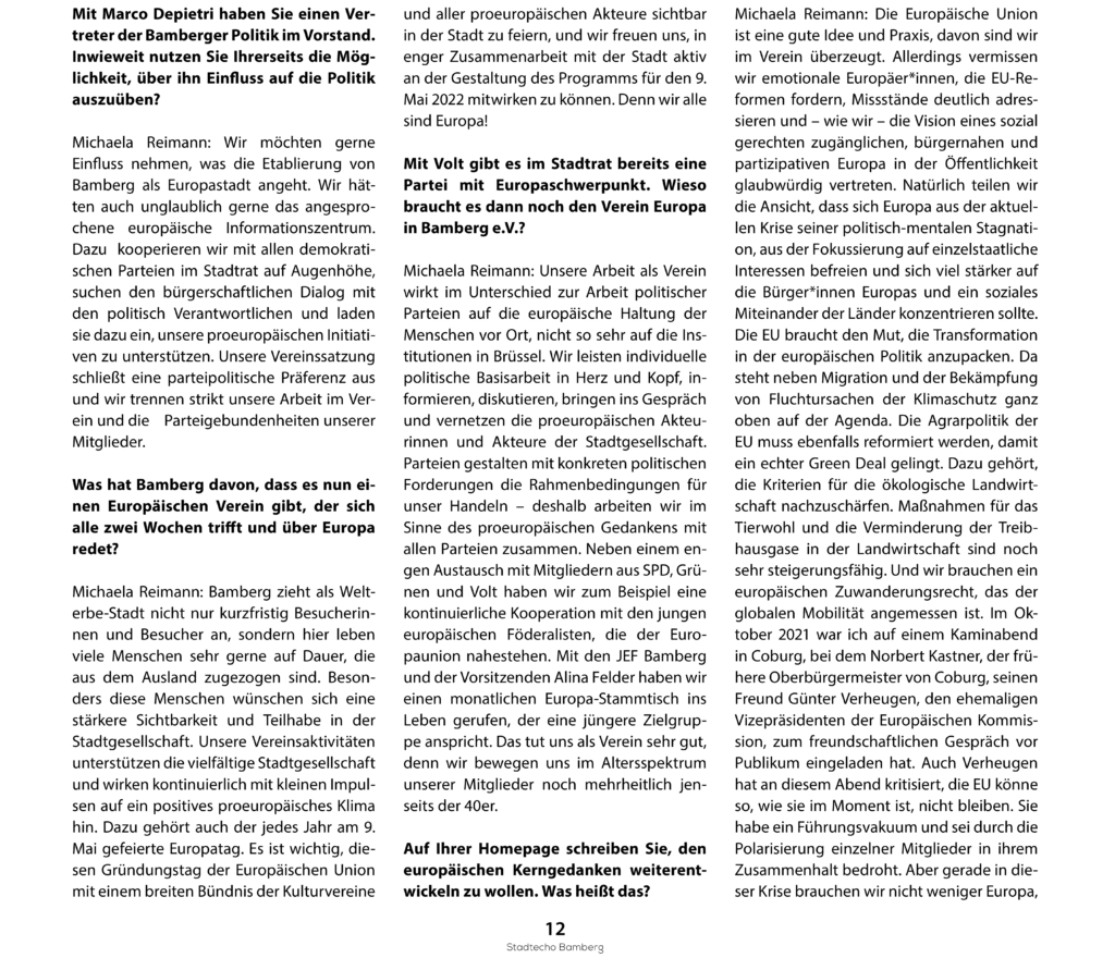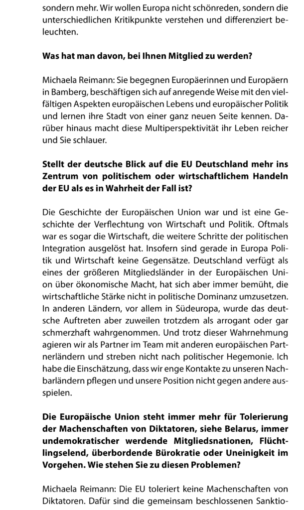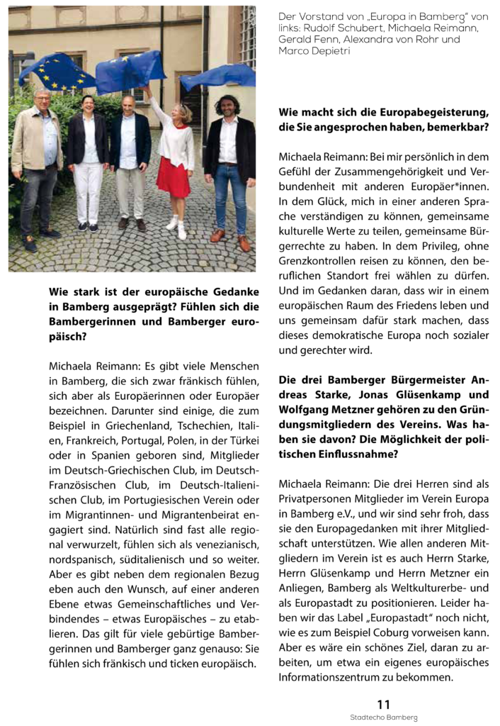 „Gemeinsam wollen wir Europa eine Stimme geben,“ ergänzt Co-Vorsitzender Rudolf Schubert. „Wir wollen für lebendige Aktionen sorgen, die Europa sichtbar machen. Vor allem aber wollen wir das Zusammenleben aller Menschen in Bamberg, unabhängig von ihrer Herkunft fördern. Getreu dem europäischen Motto der ‚Einheit in Vielfalt‘.“