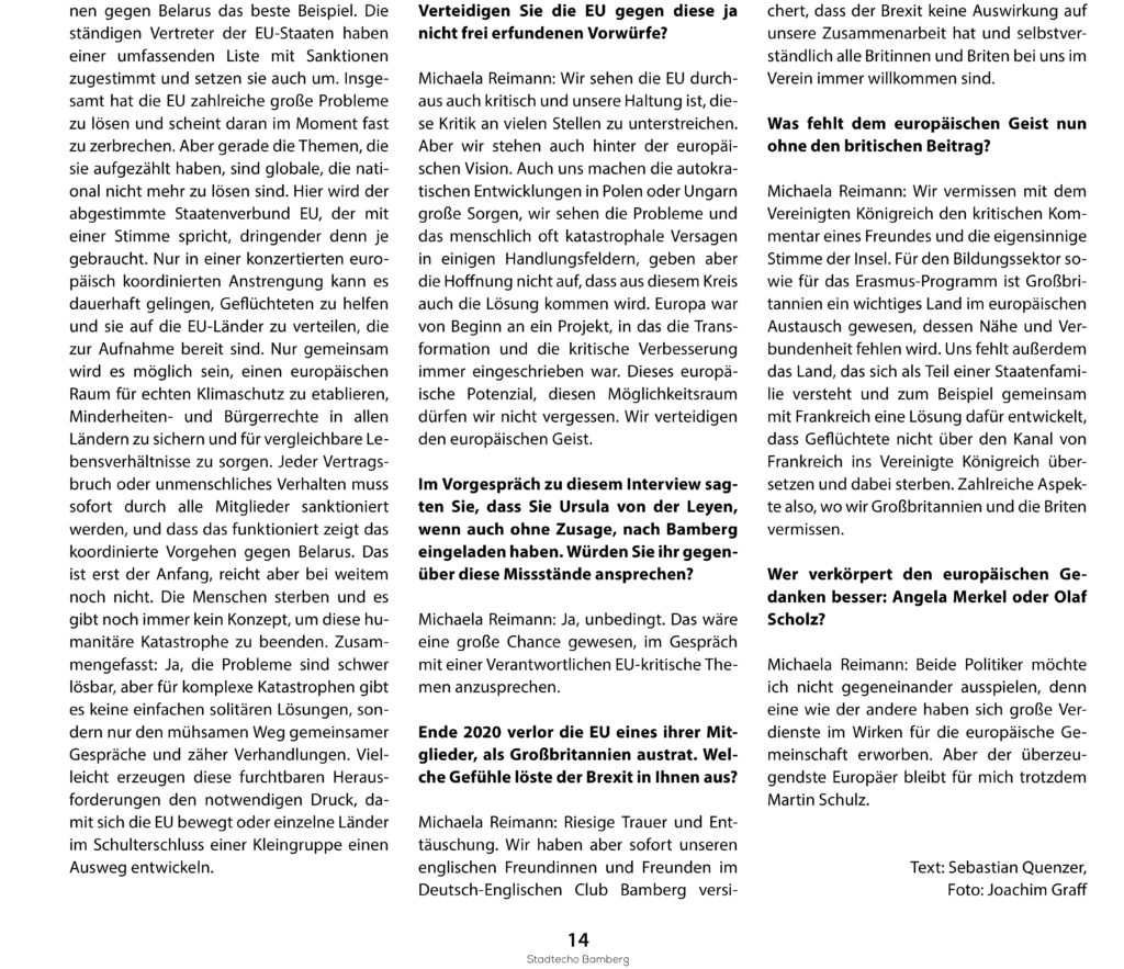 Wir im Verein Europa in Bamberg sind dankbar für die Anstrengungen, die auf beiden Seiten unternommen werden, damit eines Tages Beitrittsgespräche zwischen der Ukraine und der Europäischen Union aufgenommen werden. Auch wenn dieser Prozess noch länger dauern wird – für uns als Europäerinnen und Europäer in Bamberg seid ihr längst ein Teil der europäischen Familie. Wir stehen an eurer Seite – ihr gehört zu uns!