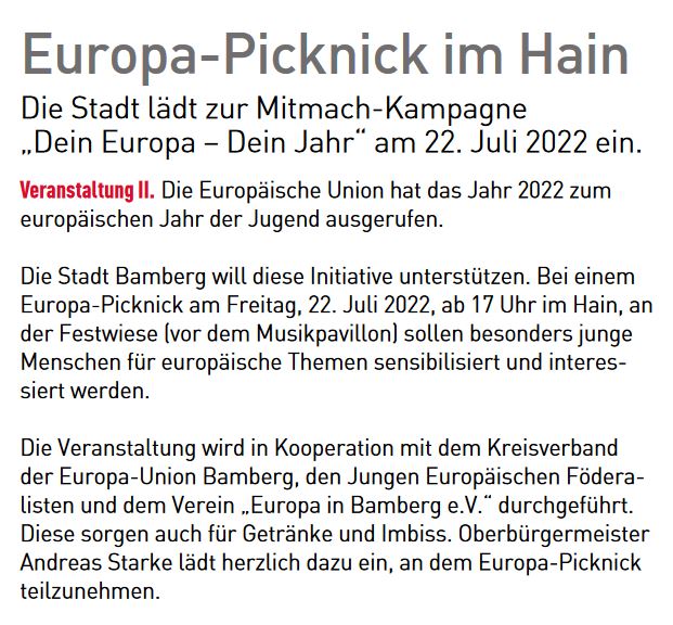 Bamberg hat einen neuen Verein: „Europa in Bamberg“ versteht sich als überparteiliches Bündnis zur Förderung internationaler Solidarität, Toleranz und Völkerverständigung im Sinne der europäischen Idee. Ziel des Vereins ist es , „als Bürgerinnen und Bürger Bewegung in Bamberg zum Erhalt der europäischen Vision und zur Förderung eines europäischen Geistes beizutragen“, wie es in der Pressemitteilung…. Hier weiterlesen